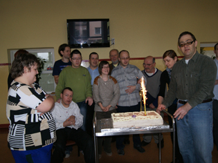 01 lutego odbyła się kolejna, już trzynasta, rocznica powstania naszej placówki. Zaśpiewaliśmy uroczyste "sto lat", następnie podziwialiśmy tort przygotowany przez uczestników pracowni gospodarstwa domowego, by po chwili ze smakiem go skonsumować. Kolejnym punktem spotkania był zabawny quiz podczas którego każdy uczestnik mógł wykazać się wiedzą dotyczącą warsztatu. Dodatkową zachętą do jak najszybszego udzielenia poprawnej odpowiedzi była nagroda w postaci słodkiego upominku. Miłym zakończeniem spotkania była projekcja zdjęć z naszej dotychczasowej działalności.